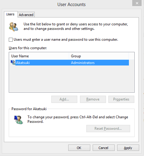 Sau khi điền lệnh trên và enter bạn sẻ được đi đến một form như hình dưới. Hãy bỏ chọn "Users must enter a user name and password to use this computer" Sau đó ấn "Apply" và xác minh mật khẩu để xác minh kích hoạt tính năng log on vào windows 8.